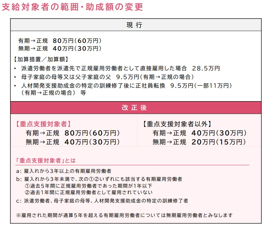 また、多くの企業様が利用可能かつ申請されていると思われる「正社員化コース」での改定もありますので、ぜひチェックしてください。